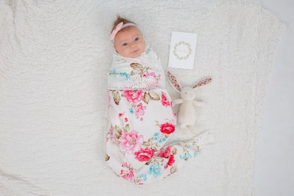 Our Bespoke Lace Swaddle Wrap in Wild Blossom is exquisitely handmade from the softest of cottons and encased in cotton lace. We carry the licensed Australian Made Logo and with our superior Triple Stitched System that is like no other our quality surpasses all.